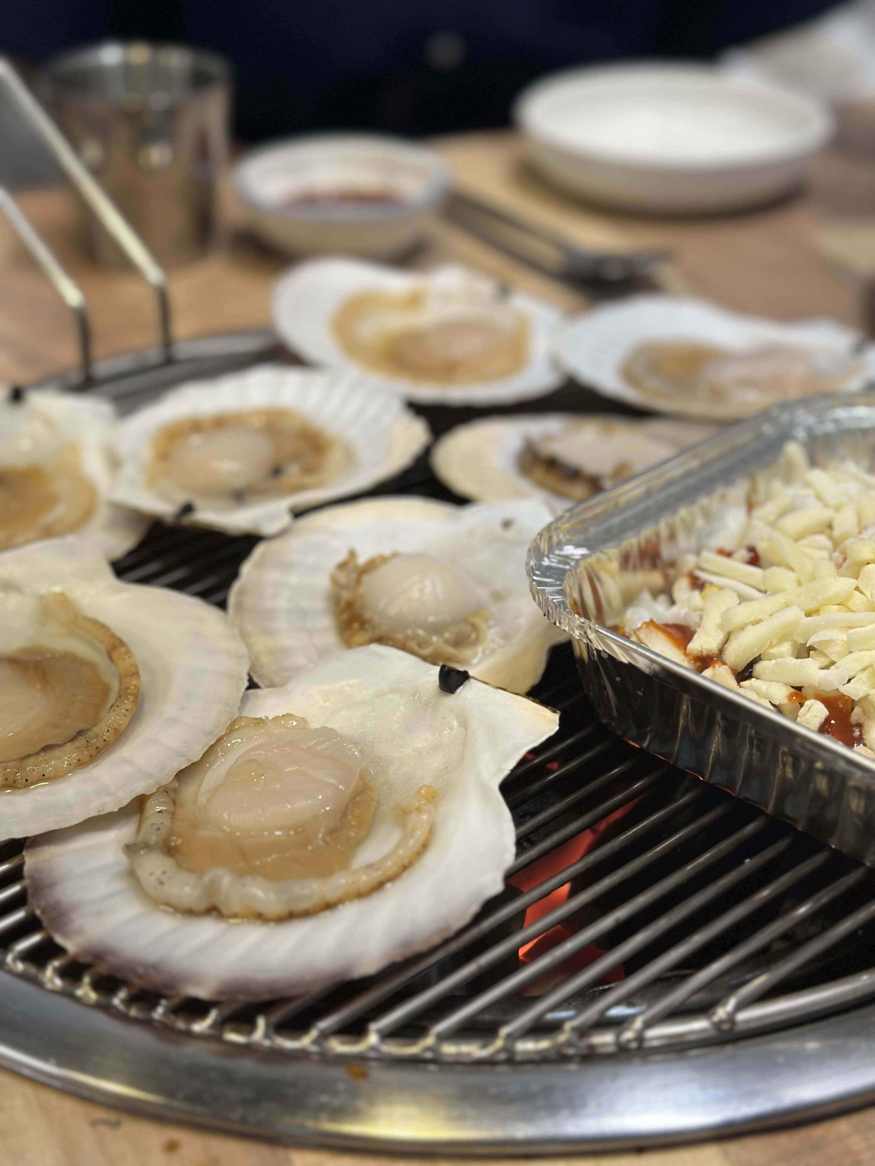 가리비는 가운데에서굽고 목살은 불판 외곽쪽으로 두고 천천히 익혀주면됩니다.